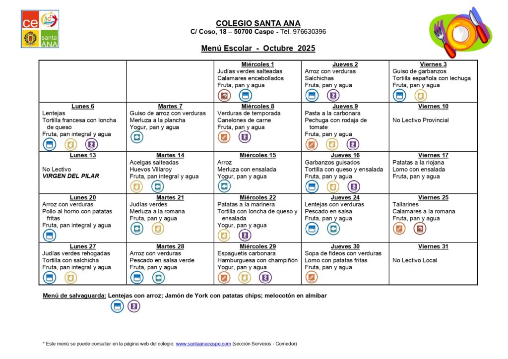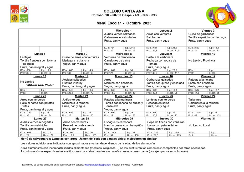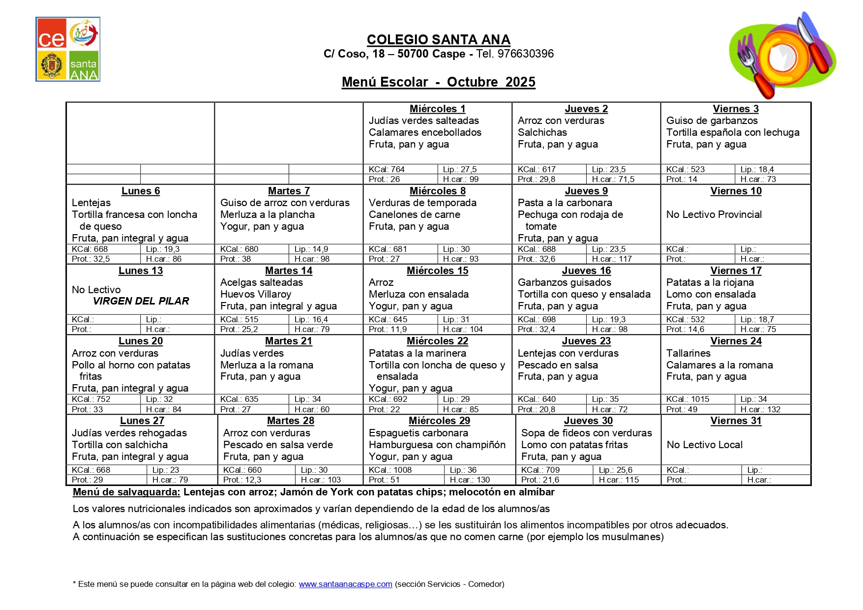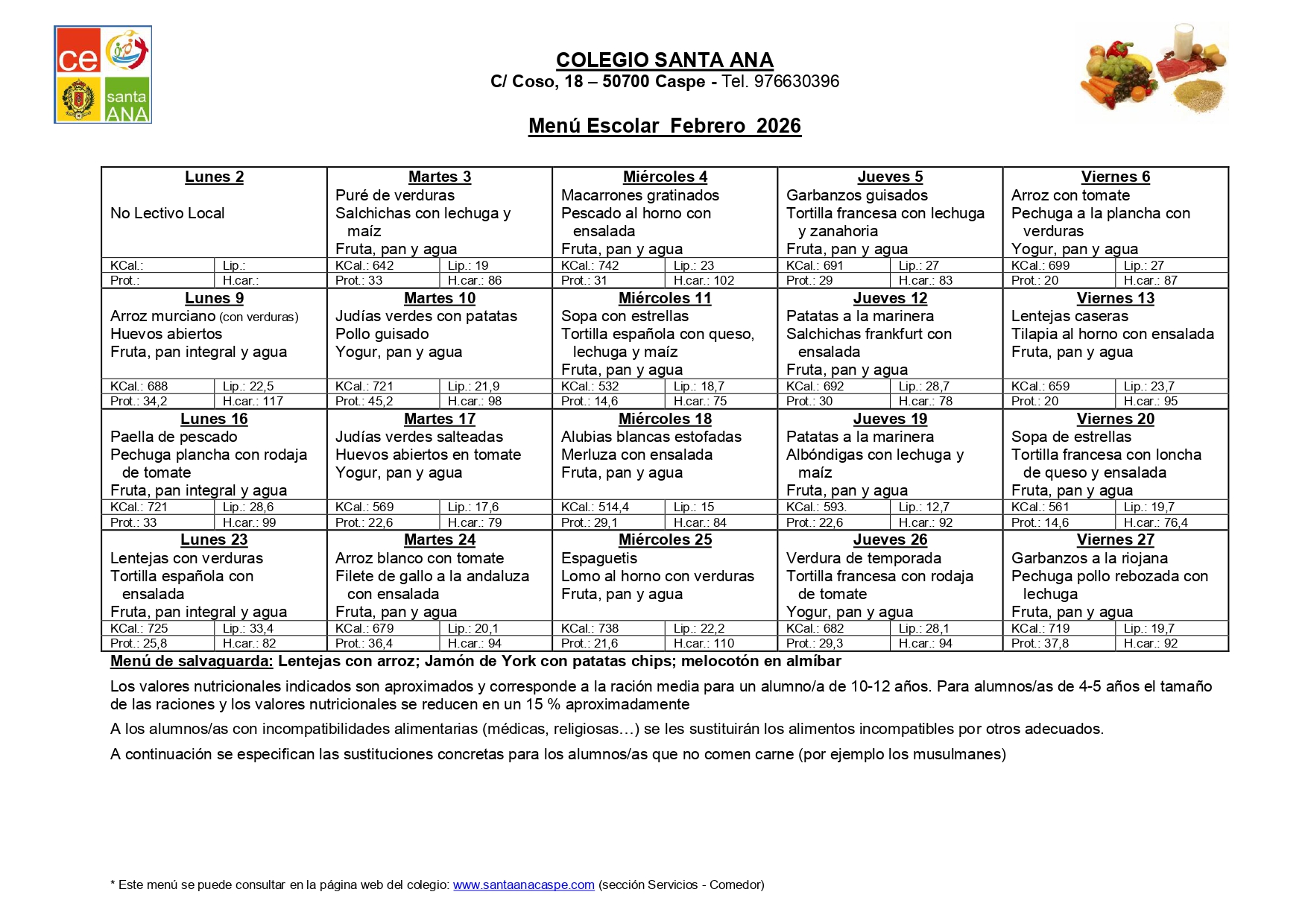 Los valores nutricionales indicados en cada comida son aproximados y corresponden a una edad entre 8 y 12 años. De 3 a 8 años los valores se reducen en un 25 % aprox.